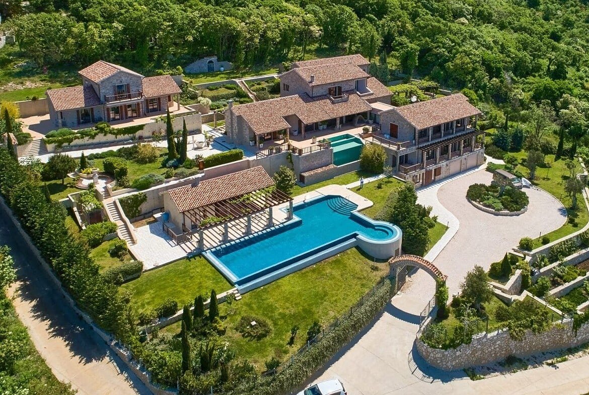 The estate includes a main house of 1,769 m², a guest house of 297 m², and a pool house of 126 m², allowing ownership to extend beyond the principal residence into a fully composed private domain. The setting is elevated, quiet and protected, with open views across the Montenegrin coast and a sense of distance that immediately changes the atmosphere on arrival.